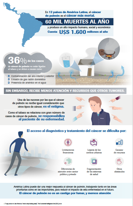 La investigación denominada “Cáncer de Pulmón en América Latina: es hora de dejar de mirar hacia otro lado”,  se llevó a cabo en Argentina, Bolivia, Brasil, Chile, Colombia, Costa Rica, Ecuador, México, Panamá, Paraguay, Perú y Uruguay. Este estudio indicó que, esta enfermedad produce más de 60.000  muertes cada año en dichos países, con un costo anual superior a los  US$1.600 millones.
