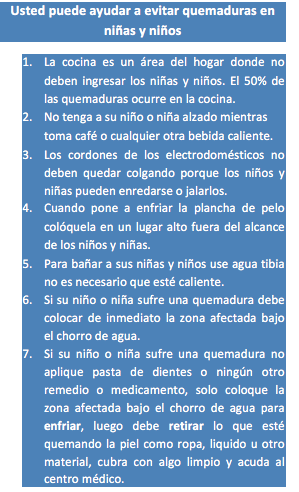 En 80 de cada 100 casos de niños y niñas que sufrieron quemaduras,  los niños estaban al cuidado de un adulto y el hecho ocurrió en tan sólo un segundo de descuido. Evitar esos descuidos y prevenir quemaduras son los objetivos básicos que persigue una campaña dirigida a padres de familia y cuidadores de niños  en todo el país.