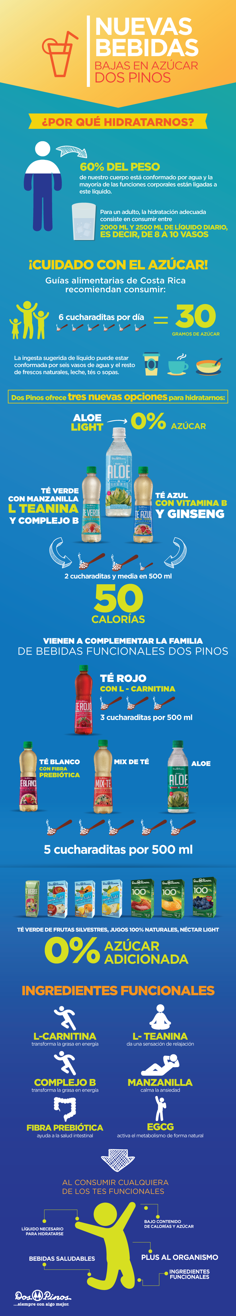 La hidratación es un hábito primordial que los seres humanos deben practicar varias veces al día para lograr un adecuado desarrollo y funcionamiento adecuado del organismo, pues, un 55% de nuestro peso, proviene del agua. Para ayudar a cumplir el con este importante hábito de alimentación, Dos Pinos amplió la variedad de sus bebidas funcionales que, además de colaborar con la sana hidratación, tienen un rico sabor y ofrecen beneficios adicionales importantes para la salud.Bebidas_Bajas_Azucar