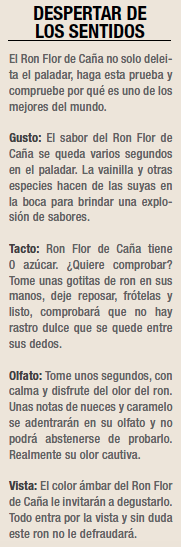 Notas de nueces y caramelo que encantan el olfato, un color ámbar brillante que seduce a primera vista y un sabor a vainilla intensa y especies con un suave y prolongado acabado que despierta el paladar, todo ello gracias al exquisito Ron Flor de Caña.