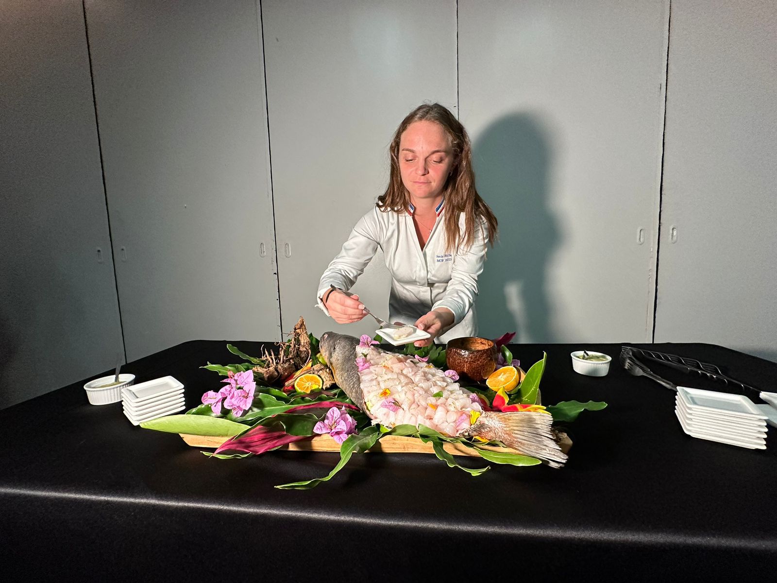 La chef francesa Sonia Bichel prepara una de sus especialidades con pescado fresco.