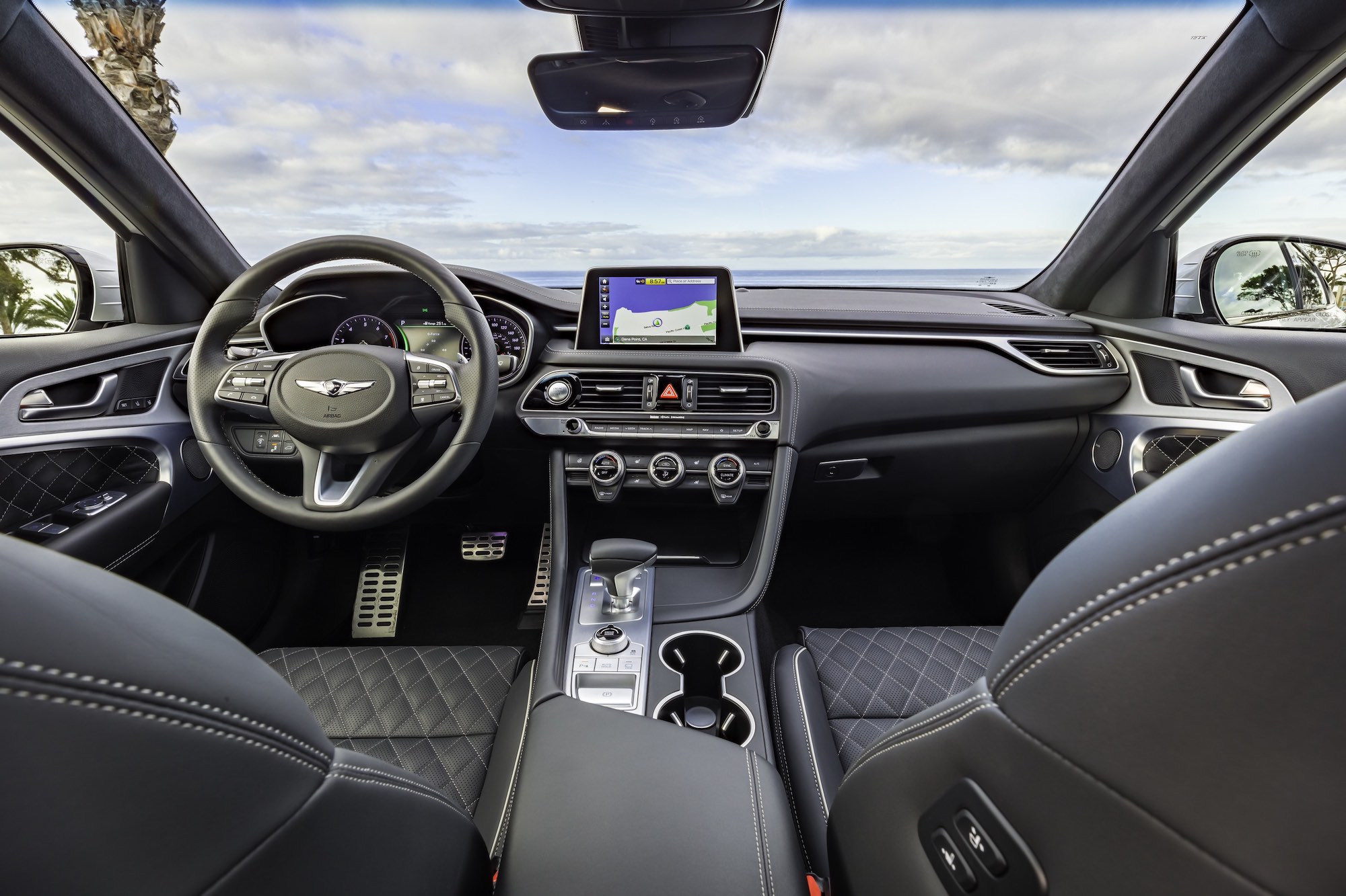 En su interior el Genesis G70 ostenta un diseño de lujo en el que el aluminio y la piel se entrelazan para dar paso a una consola de controles con acabados de la mas alta calidad. Sus asientos sobresalen por un diseño de piel acolchonado, con el trazo de costuras resaltando detalles en forma de diamante. Pero su parte protagónica la ocupa una pantalla táctil de 8”.