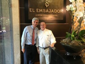 El Hotel Embajador es ahora parte de la marca Royal Hideaway Hotel, perteneciente a Barceló Hotel Group, nos dice el señor Serra. Dada sus amenidades y estratégica ubicación en Santo Domingo, es el favorito de los visitantes de negocios a la capital de la República Dominicana. El Embajador es un punto de partida ideal para conocer la zona histórica y colonial; y empaparse de toda la idiosincrasia dominicana. El hotel cuenta con habitaciones elegantes y cálidas; y unas modernas instalaciones, como la gran piscina y el gimnasio, que garantizan una estadía divertida, equilibrada y con el mejor descanso. Mención aparte merece la rica oferta gastronómica, que incluye desde un completo desayuno buffet internacional hasta una sublime cena romántica en el restaurante gourmet El Jardín, con uno de los ambientes más cautivadores de la ciudad.