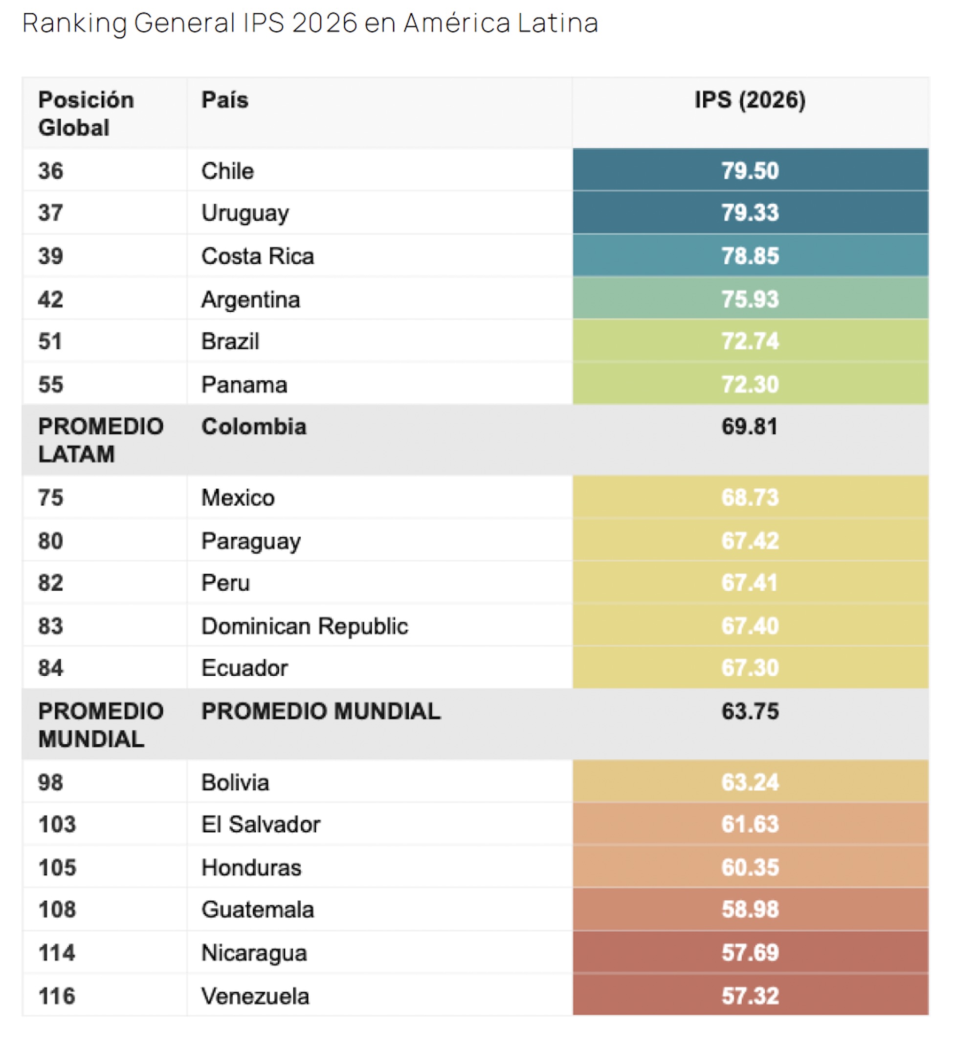 Con un puntaje promedio de 69,81, América Latina se sitúa por encima del promedio mundial (63,75). Sin embargo, esepromedio regional oculta trayectorias profundamente distintas. El IPS 2026 muestra que la región no avanza como un bloque homogéneo, sino a través de caminos divergentes, marcados por ritmos, prioridades y capacidades institucionales distintas.