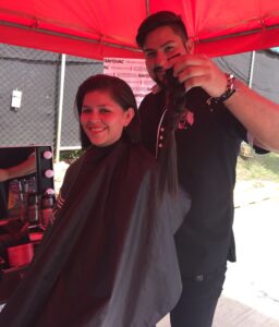 La contadora señaló… “Al ver a las pacientes entregando kits, me toco el corazón y decidí cortarme el cabello, me dio mucho pesar porque lo venía cuidando desde el 2006, pero es para una buena causa y mi pelo vuelve a crecer”.  “Mis compañeros de trabajo, me animaron a hacerlo, porque mi cabello es sano, natural, y llena los requisitos para la confección de las pelucas ”.