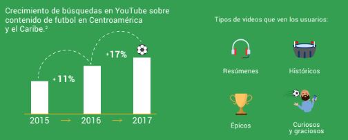 El contenido de video juega un papel importante para los amantes del fútbol, hay quienes prefieren ver los resúmenes, los videos históricos, épicos, curiosos y graciosos del fútbol. Tan solo en Centroamérica el crecimiento de búsquedas en Youtube sobre contenido de fútbol de 2015 a 2016 fue de más del 11% y de 2016 a 2017 aumentó más del 17%.