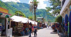 Panajachel. En su casco antiguo destaca la iglesia de San Francisco, de arquitectura colonial, con su fachada hecha de piedra. Además, en la localidad del altiplano guatemalteco, se encuentra la calle Santander, arteria principal del municipio, con cafeterías, bares y puestos de venta de artesanía y textiles.