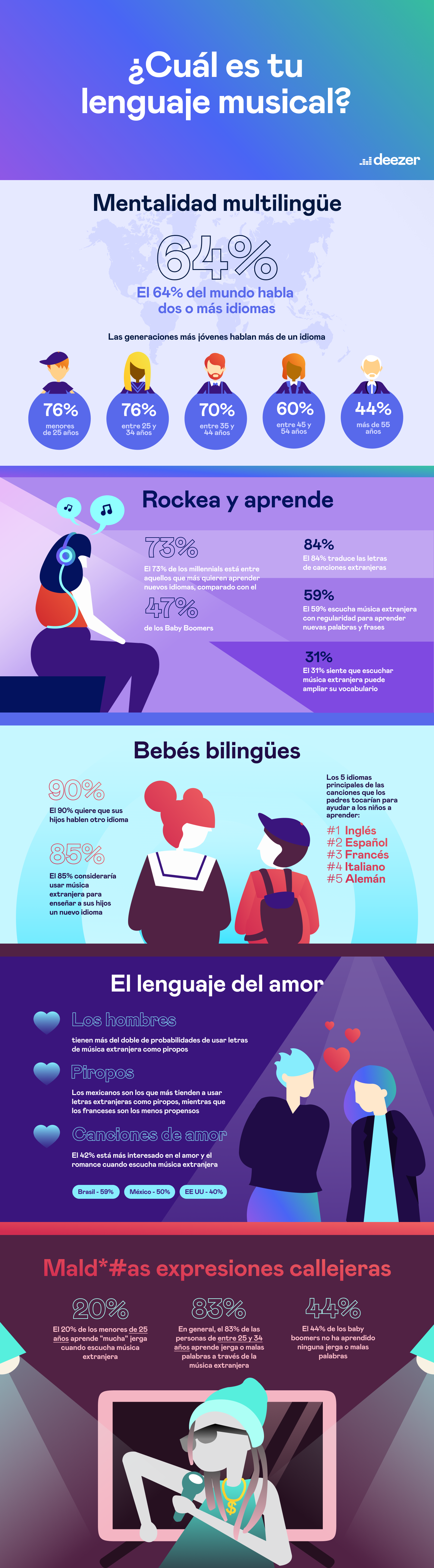 Deezer trabajó con la experta en idiomas y música Susanna Zaraysky y encuestó a 12.000 personas en seis países para ver cómo la música puede ayudarnos a aprender nuevos idiomas. Resulta que es algo que muchos de nosotros ya estamos haciendo. Más de la mitad (59%) de la gente que participó en la encuesta utiliza la música como herramienta para aprender nuevos idiomas. Los mexicanos y brasileños son los que más usan la música para aprender idiomas (81% y 76%, respectivamente), pero solo el 48% de los alemanes puede decir lo mismo.