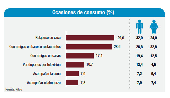 En términos de ocasiones de consumo, las mujeres prefieren consumir cerveza para compartir con amigos en bares o restaurantes (on premise). También se observa preferencia para relajarse en casa. Las consumidoras de bebidas alcohólicas saborizadas (BAS) tienden a preferir esta bebida antes