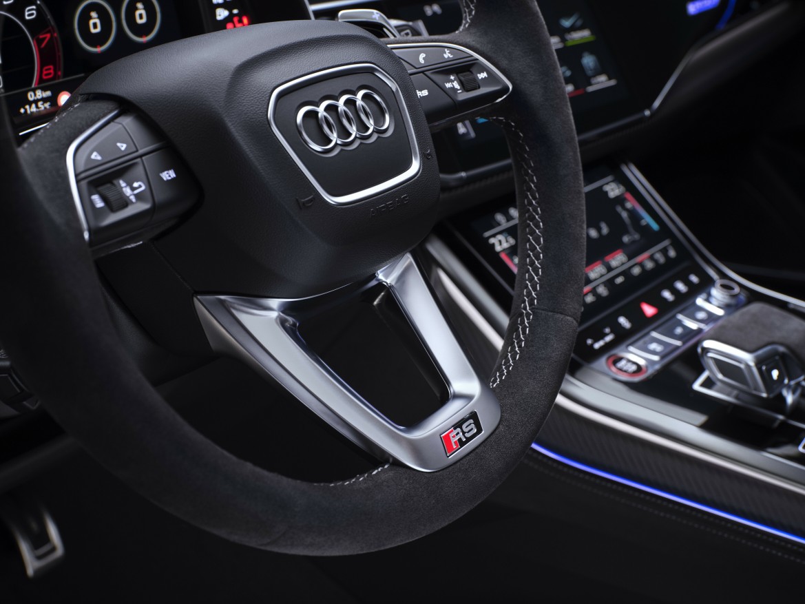 El paquete dinámico opcional plus para el RS Q8 ofrece un rendimiento aún mayor, lo que le da al coche una velocidad máxima de 305 km/h. Los componentes adicionales incluyen la estabilización de balanceo electromecánica activa, el diferencial quattro sport y el sistema de frenado de cerámica RS (que viene de serie en el RS Q8 performance). La dirección estándar en las cuatro ruedas con accionamiento de husillo eléctrico de alto par contribuye a la agilidad y la estabilidad. Al cambiar de carril rápidamente, las ruedas traseras giran hasta 1,5 grados en la dirección opuesta a las ruedas delanteras. A velocidades más bajas, giran hasta cinco grados en la dirección opuesta a las ruedas delanteras. Esto reduce el radio de giro en consecuencia.