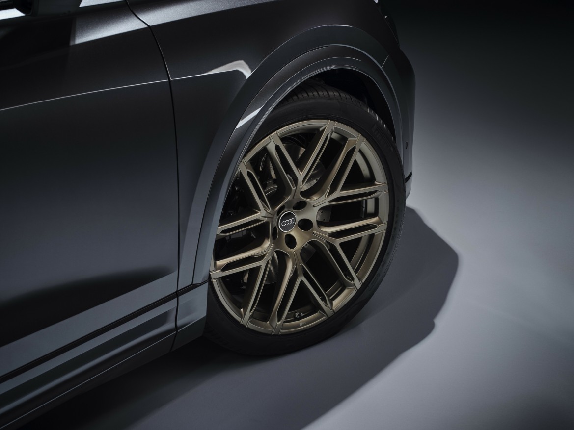 Como opción exclusiva para el RS Q8 performance, hay disponibles llantas de aleación ligera de 23 pulgadas, que se fabrican mediante un proceso de forja y fresado de alta tecnología. Inspirado en los deportes de motor, el diseño de radios de 5 Y garantiza una refrigeración óptima de los frenos. También reducen la masa no suspendida en alrededor de cinco kilogramos cada una en comparación con las ruedas estándar de 22 pulgadas. La reducción de peso total de alrededor de 20 kilogramos mejora la respuesta del acelerador del coche. Están disponibles en negro metálico bruñido, gris mate o negro mate. Los clientes también pueden elegir los neumáticos Pirelli P Zero 295/35 R23 de alto rendimiento, que ofrecen un mejor agarre constante en carreteras húmedas y secas, lo que hace que el manejo sea más preciso y dinámico.