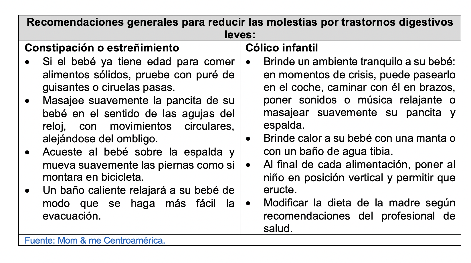 1.Dar al niño leche materna de forma exclusica al menos durante los primeros seis meses de vida. Se ha comprobado que el Lactabacillus reuteri, probiótico presente en la leche materna, puede ejercer un efecto antiinflamatorio, reducir la cantidad de bacterias productoras de gas y por ende reducir el tiempo de llanto por cólico. Este probiótico puede ayudar a aliviar el estreñimiento al mejorar los movimientos intestinales, y aumentar la frecuencia de las deposiciones de los niños.