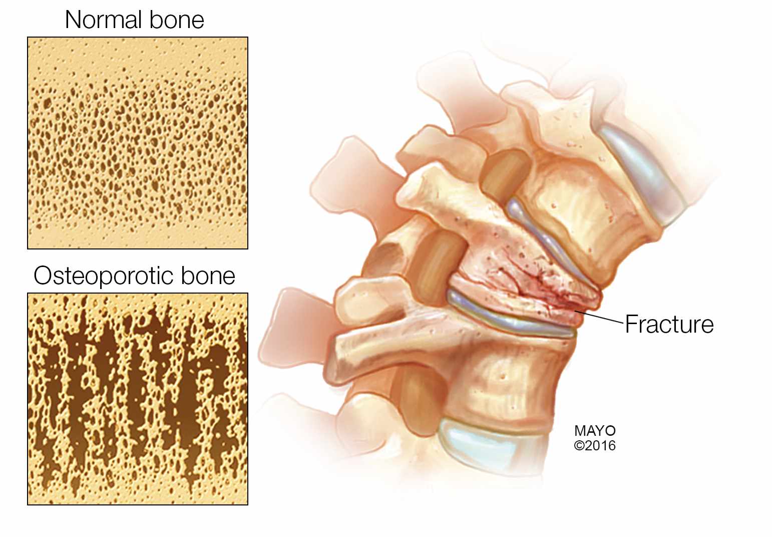 El riesgo de osteoporosis aumenta con la edad porque, a medida que uno envejece, se pierde hueso con mayor rapidez de la que el cuerpo puede producirlo. La osteoporosis se presenta cuando la producción corporal de nuevo hueso ya no puede seguir el ritmo de la descomposición del hueso viejo. Los huesos, entonces, se debilitan y pueden quebrarse con facilidad. La menopausia aumenta el riesgo de osteoporosis porque durante los primeros cinco años posteriores a la menopausia, las mujeres tienden a perder densidad ósea rápido.