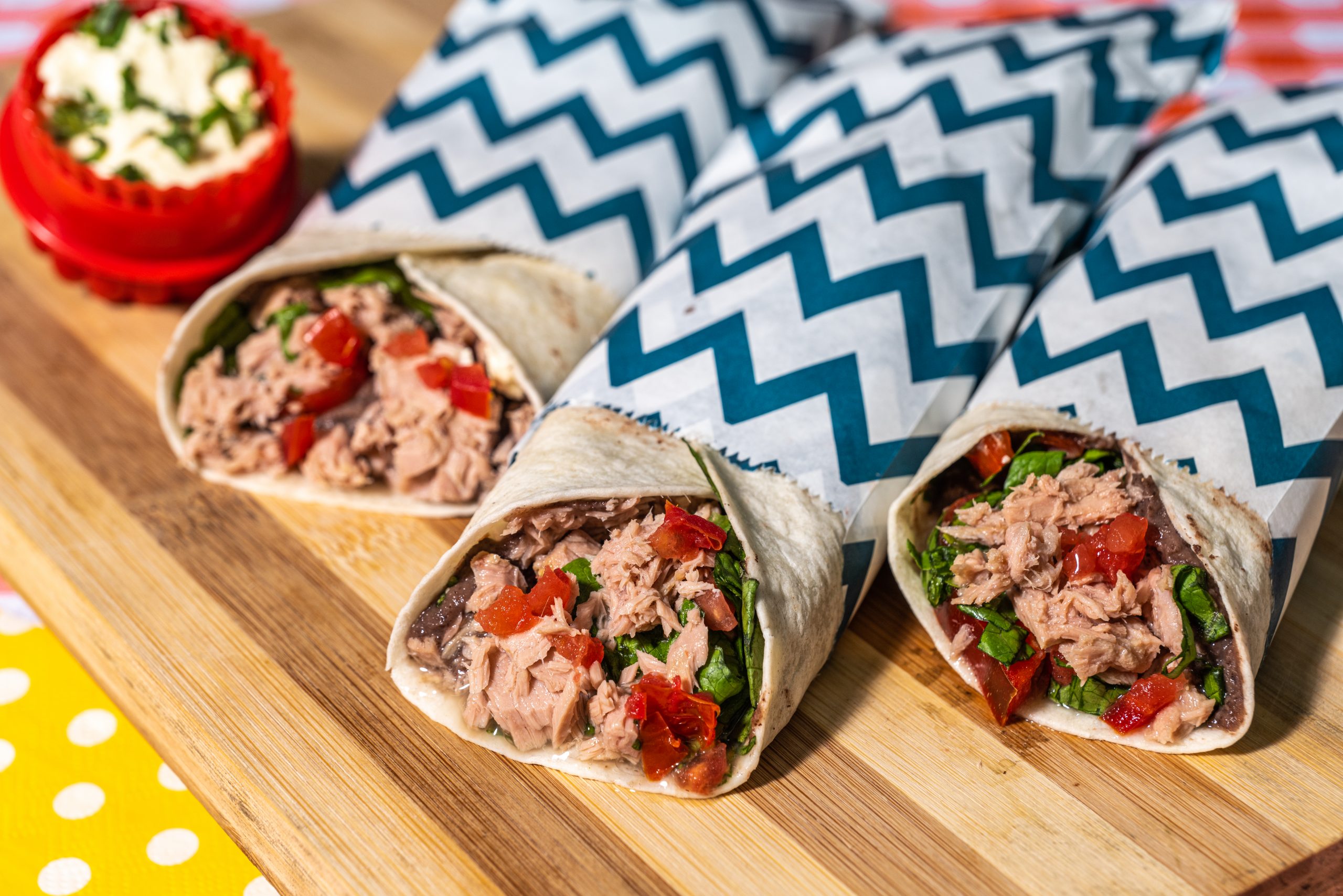Preparación: Mezclar el tomate, chile pimiento y salpimentar. Untar los frijoles en cada tortilla, rellenar con la mezcla anterior. Agregar queso crema y Atún en aceite.