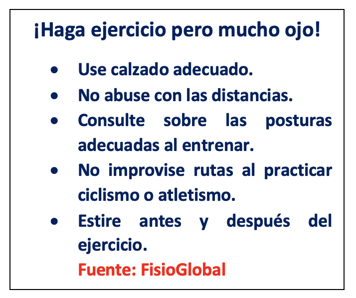 “Someter el cuerpo a un esfuerzo muy extenuante sin manejar adecuadamente un ritmo deportivo predispone a lesiones en las articulaciones. Toda clase de deporte debe ser paulatino, ojalá con la supervisión de algún profesional. Dependiendo de la disciplina que se vaya a practicar hay muchos factores a tomar en cuenta como el tipo de calzado si es atletismo, la altura del asiento de la bicicleta si el ciclismo es la opción y en caso de ejercicios funcionales también debemos cuidar mucho la postura,” señaló Lizano.
