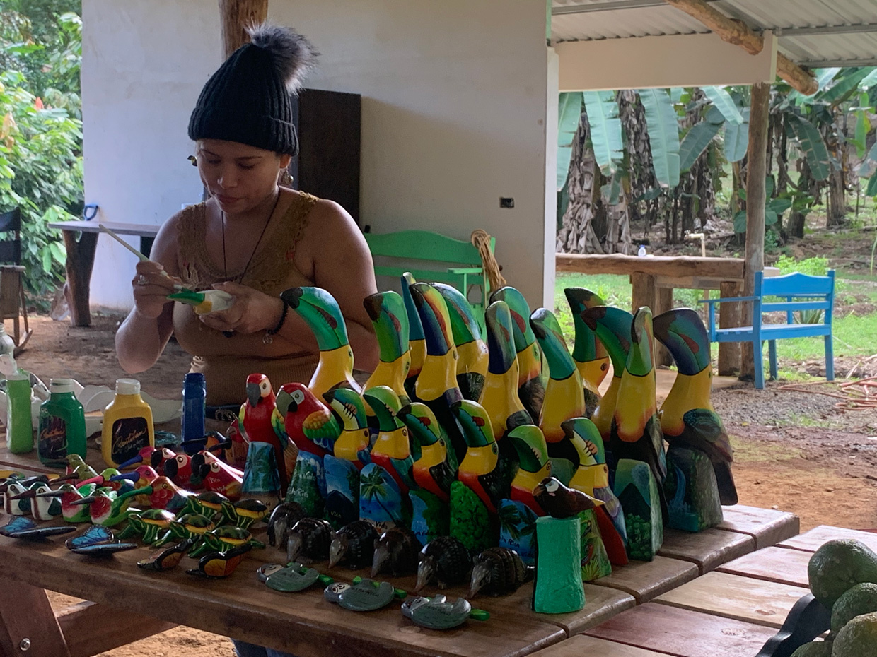 El hotel también trabaja de la mano con artesanos de la zona, como es el caso de Adela Romero, del proyecto Sol y Arena, quien elabora souvenirs a partir de palo rollizo (piezas de madera cilíndricas), el cual va esculpiendo con diversas herramientas hasta crear colibríes, gallos, gallinas, tucanes, guacamayas, mariposas, perezosos, armadillos, entre otros.