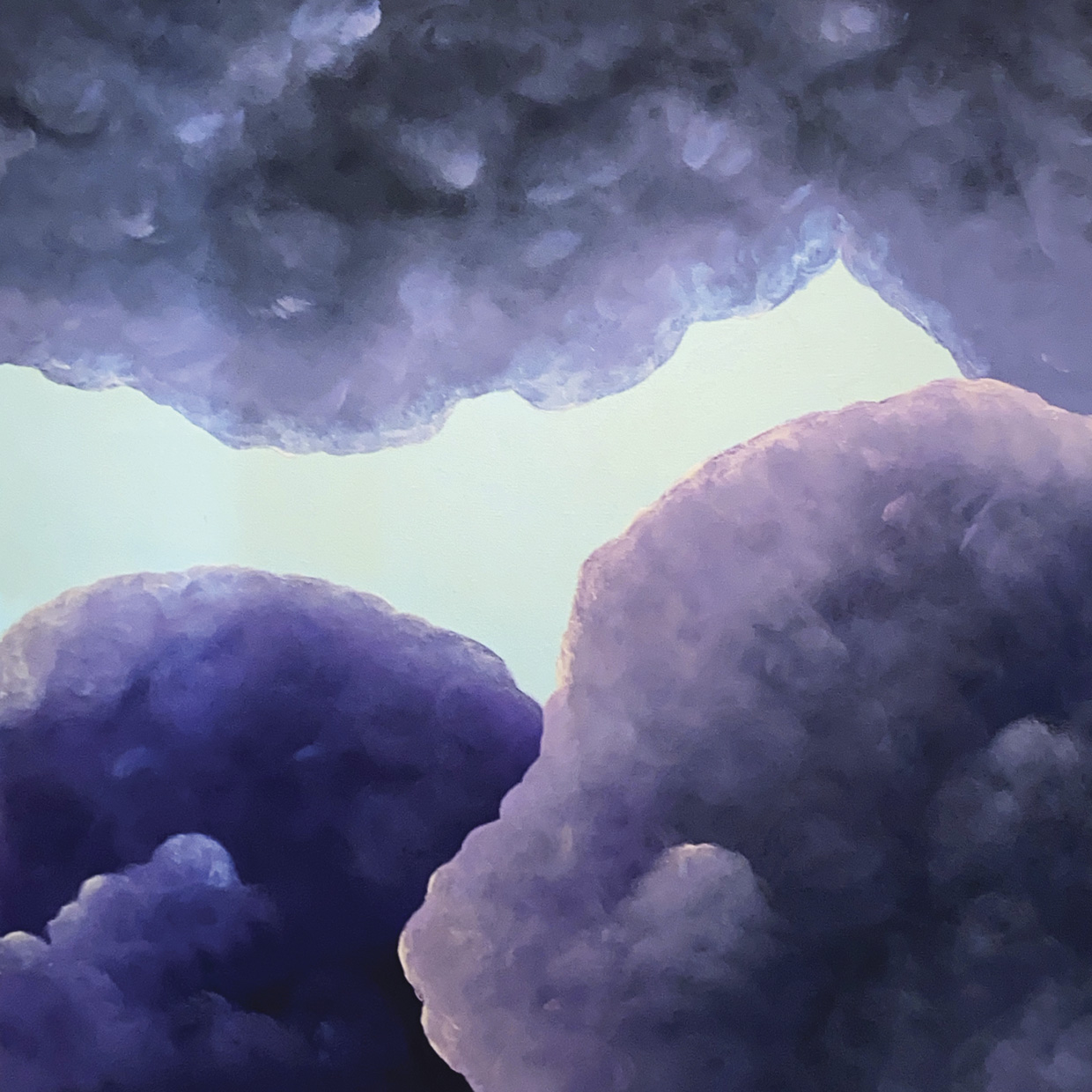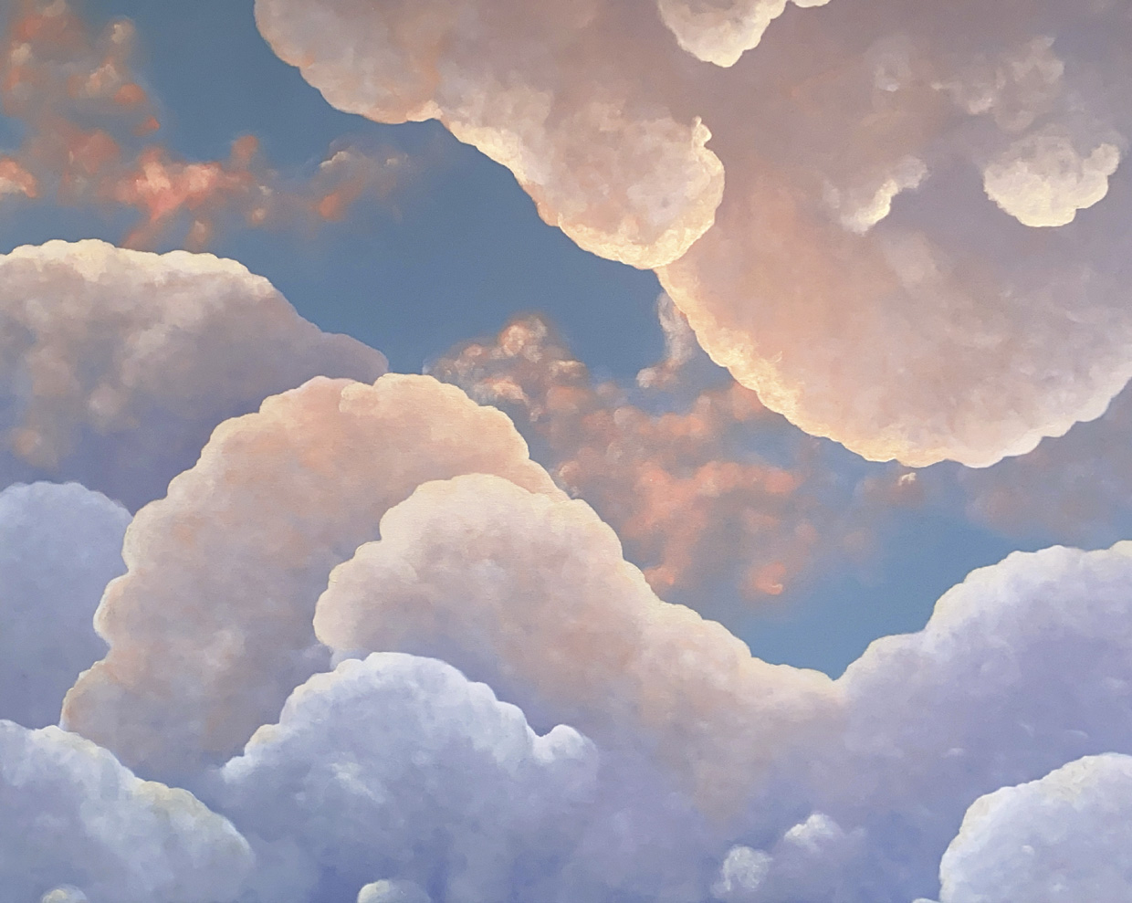 “Una faceta integral de mi práctica es el uso de pintura de interferencia, la cual cambia de color, dependiendo del punto de vista en que se observe. Cuando la posición del espectador cambia, el efecto metálico también lo hace, lo cual agrega al movimiento de las siempre cambiantes nubes en mis obras. Me gusta crear la ilusión de que mis espectadores se encuentran en las nubes”.
