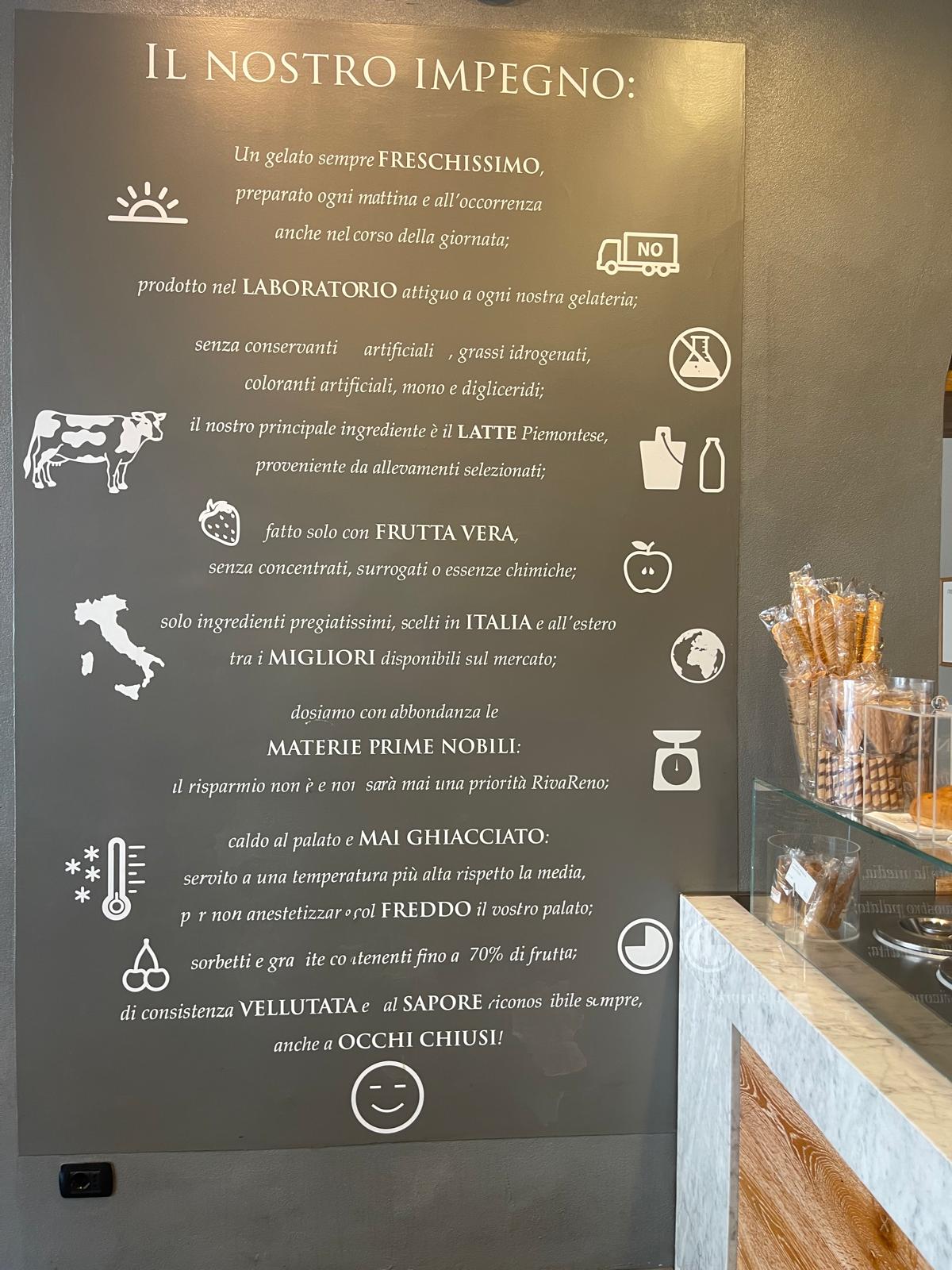 El gran éxito de RivaReno es la base artesanal del gelato, su preparación diaria, con el gelato hecho in situ y servido a una temperatura ligeramente más alta que el helado industrial para mantener su cremosidad.