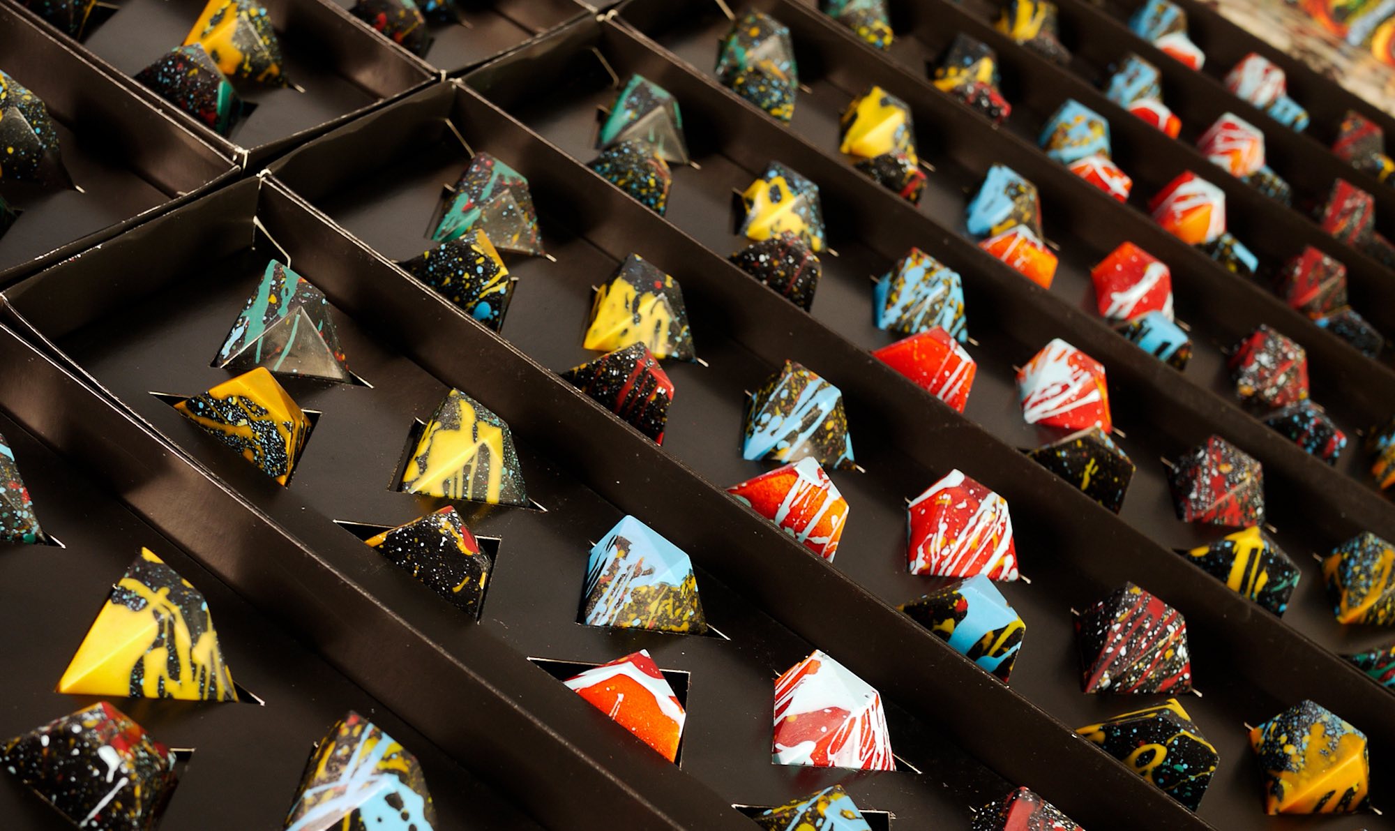 Cada una de las colecciones lleva consigo todo un estudio de mercadeo para desarrollar la estrategia y partir de ahí, definir, el relleno, los colores, técnica de la pintura, la forma del chocolate y el empaque que es el que cierra todo el concepto. Una vez que se tiene las ideas se hace una inmersión en el  taller para la creación de las piezas que son producidas  y pintadas a mano.