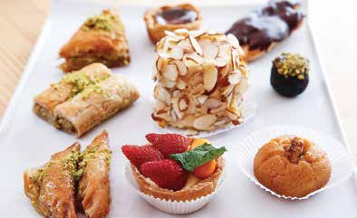 El menú no estaría completo sin su deliciosa repostería, donde uno de los dulces estrella es el baklava, pastel elaborado con pasta filo artesanal, que se rellena con pistachos, nueces o avellanas y miel de abeja, servido, si el cliente lo prefiere, con helado de vainilla artesanal.
