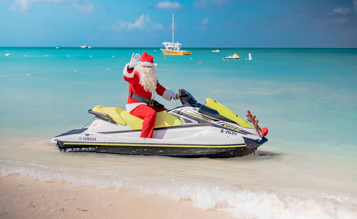 Llegada en Jet Ski a Aruba: Papá Noel llega a Candy Cane Beach Lane en el Hilton Aruba Caribbean Resort & Casino en moto acuática justo para la Nochebuena, ¡sin necesidad de renos!. Con un legado que se remonta a 1959, este complejo cuenta con una amplia selección de atracciones y servicios, como deportes acuáticos, un mariposario cercano y exóticos viajes de bienestar en el spa eforea frente a la playa, perfecto para vacacionar.