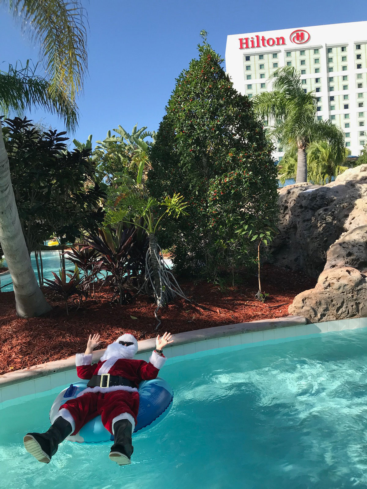 Llegada en Flotador en Orlando: En el Hilton Orlando, Papá Noel se relajará en un flotador cuando comience sus vacaciones el 26 de diciembre, descansando en el Lazy River del complejo, de 271 metros de longitud. Otras experiencias para las familias incluirán la decoración de casas de pan de jengibre, la búsqueda del tesoro de Papá Noel y más actividades que terminarán con la fiesta de inicio de las vacaciones de Papá Noel junto a la piscina. Así, Orlando presenta una oportunidad inigualable de experiencias memorables con 0% de nieve pero 100% de diversión para las vacaciones y festejos de navidad y fin de año.