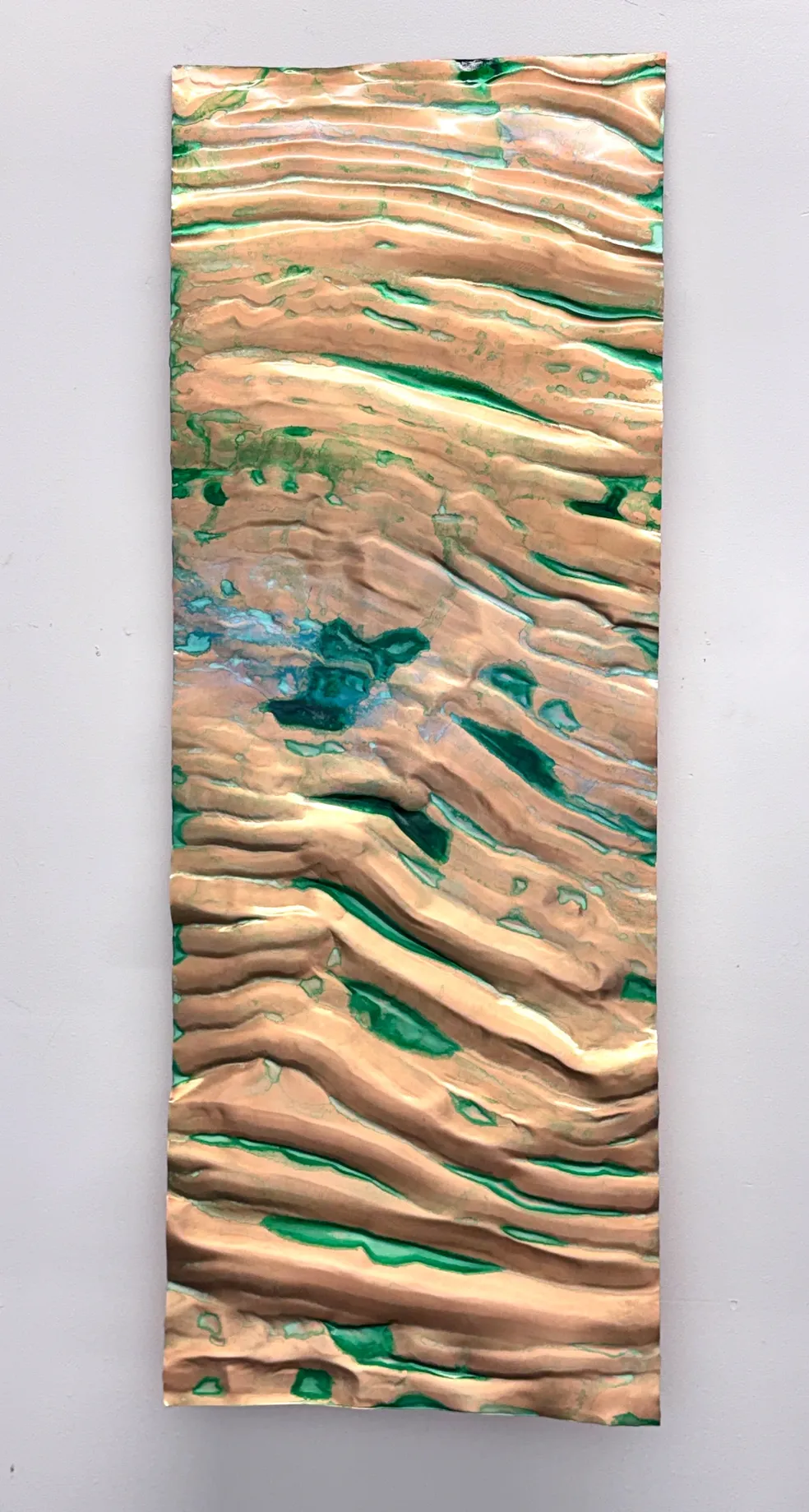 A partir de allí, Hunter transformó composiciones abstractas previas en superficies atravesadas por formas florales y orgánicas insinuadas, siempre sobre aluminio y siempre sostenidas por la lógica de la luz interior. El resultado es una pintura que sugiere crecimiento, renovación y fragilidad sin necesidad de recurrir a una descripción literal.