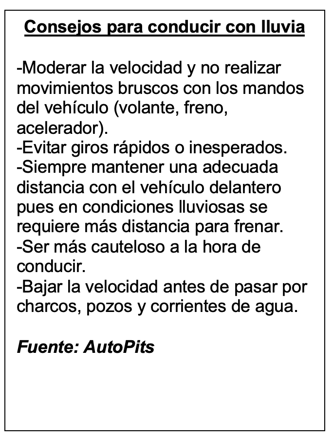 “Es muy importante saber que en época lluviosa debemos cambiar la manera de conducir, manejar más despacio y mantener una mayor distancia respecto a los otros automóviles”, agregó Agüero.