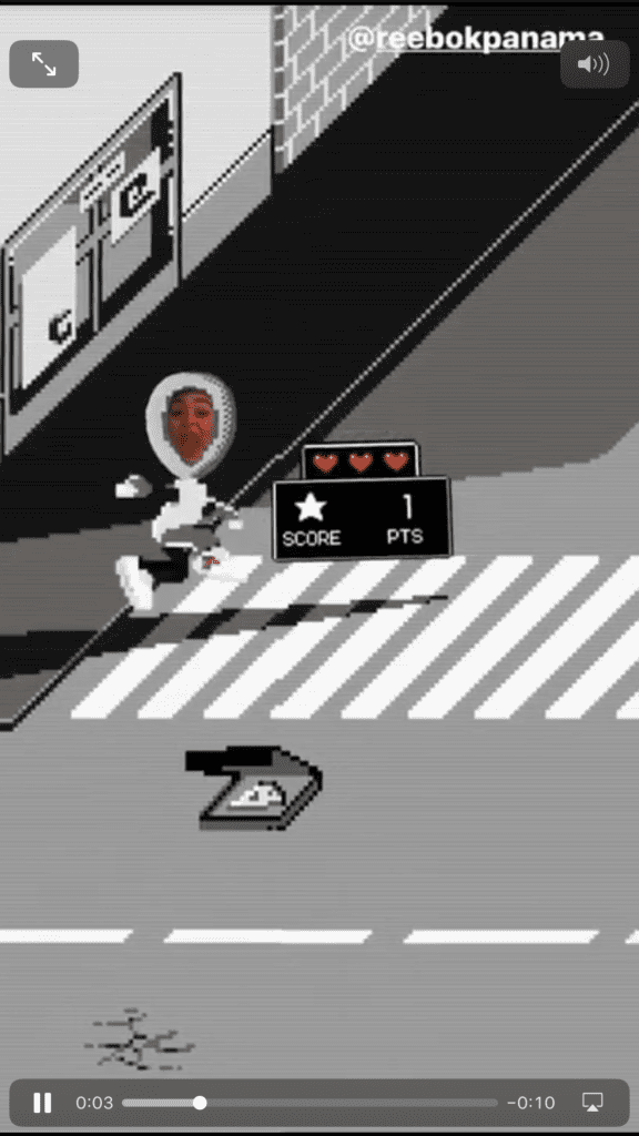 Reebok buscando ganarse un consumidor híper-conectado y joven (Generación Z & Millennials) se ha unido a Facebook para desarrollar una solución que integre de una forma natural su legado, y permita que las comunidades puedan participar de la historia, creando «ICONS”, un juego de realidad aumentada de Instagram/Facebook con un look vintage de «Arcade» que combina las zapatillas, la identidad visual de la marca e influencers de una manera orgánica.