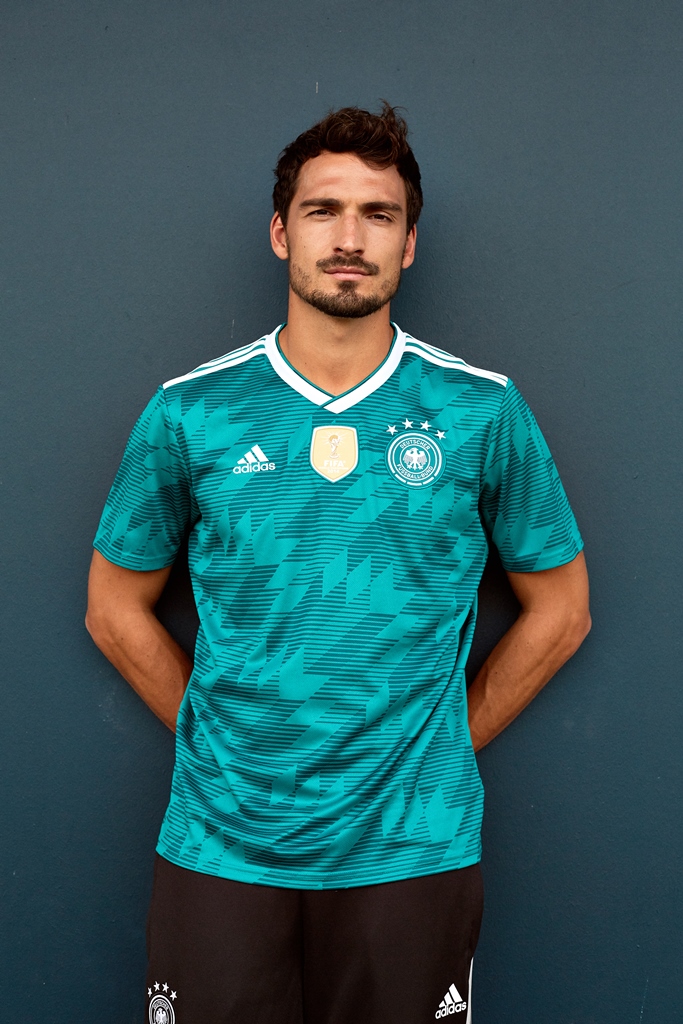 El uniforme de visitante de los actuales ganadores de la Copa Mundial de la FIFA, Alemania, es una moderna interpretación de la famosa camiseta de visitante color verde usada en la semifinal de la Copa Mundial de 1990 contra Inglaterra. La gráfica en la parte delantera toma inspiración del patrón del uniforme local de Alemania, mientras que una nueva ejecución en el cuello con construcción compuesta por doble tela incorpora el gráfico de la camiseta, junto con el texto oficial «DIE MANNSCHAFT» en la parte trasera.