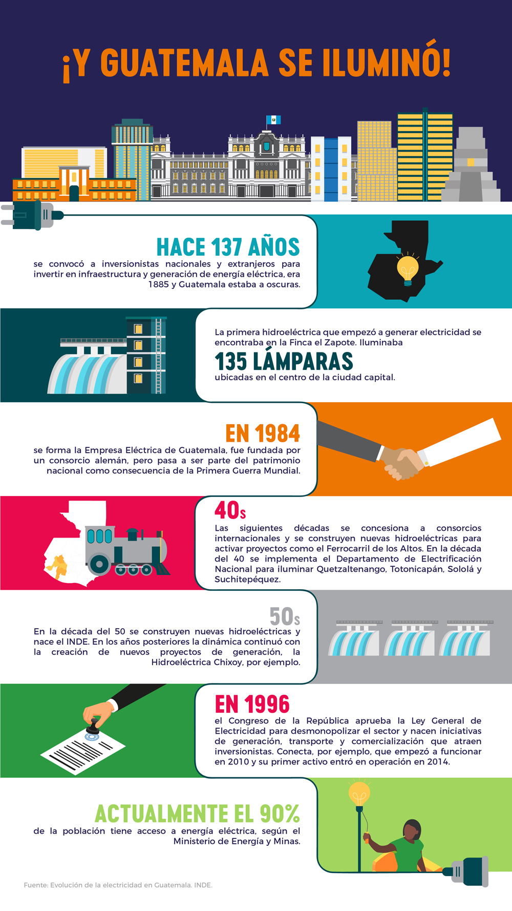 En 1984 se forma la Empresa Eléctrica de Guatemala y hoy en día el 90% de la población tiene acceso a la energía eléctrica según el Ministerio de Energía y Minas.