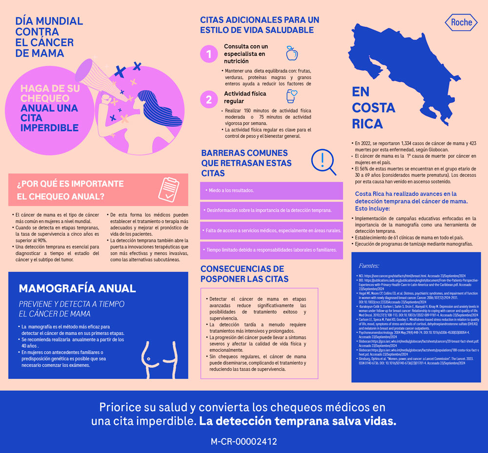 Recursos para los pacientes:● Compartiendo el viaje: Diario de apoyo de pacientes para pacientes, iniciativa para apoyar a quienes son diagnosticadas con cáncer de mama, con herramientas que les permitan sentirse acompañadas en el proceso, lograr una atención más oportuna y una inserción más rápida en el sistema de salud. ● Roche Contigo, plataforma con información valiosa, confiable y verificada sobre diversas enfermedades como cáncer de mama, cáncer de pulmón, cáncer de hígado, hemofilia, esclerosis múltiple, entre otras, y su abordaje integral. |