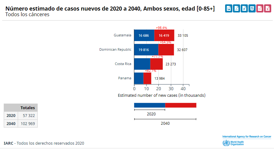 En el caso de Costa Rica, según las predicciones de la Agencia Internacional de Investigación sobre el Cáncer (IARC) de la Organización Mundial de la Salud (OMS), el aumento de casos de cáncer al 2040 sería de un 77%; es decir, se prevé que a esa fecha el número de casos llegaría a 23 273.