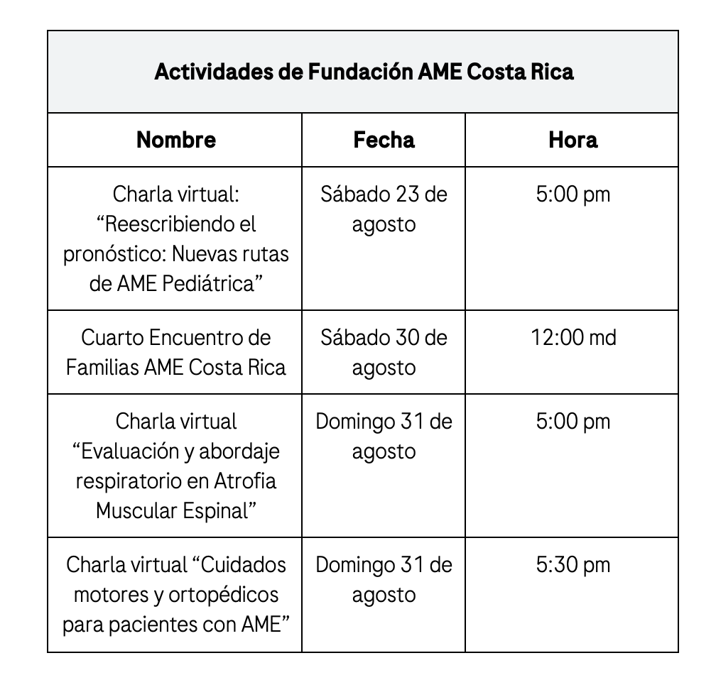 Durante este mes, la Fundación AME Costa Rica realizará una serie de actividades, todas gratuitas y en formato virtual. Para conocer más detalles pueden consultar las redes sociales de la Fundación AME Costa Rica o escribir a fundacionamecr@gmail.com
