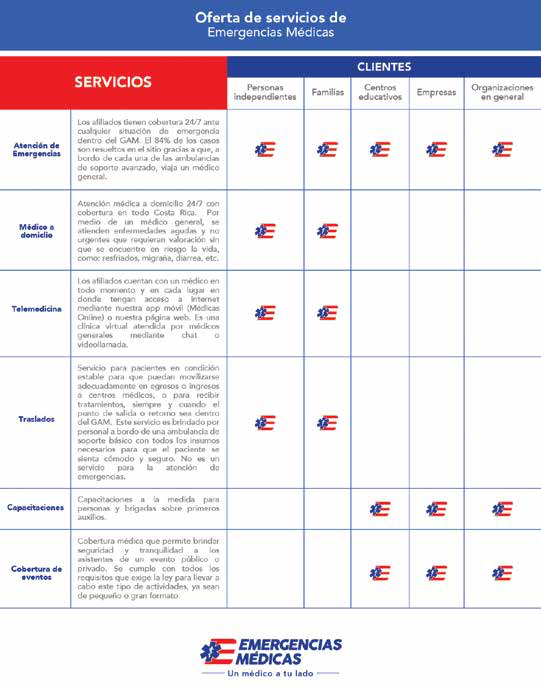 La oferta de servicios de Emergencias Médicas se brinda mediante 17 unidades de soporte avanzado de vida y cobertura en el Gran Área Metropolitana de Costa Rica, con nueve puntos de salida, desde Paraíso de Cartago hasta el Coyol de Alajuela, adicionando el uso de plataformas tecnológicas para telemedicina. Incluye una aplicación móvil, así como atención médica domiciliaria en todo el territorio costarricense, en un horario 24/7, los 365 días del año.