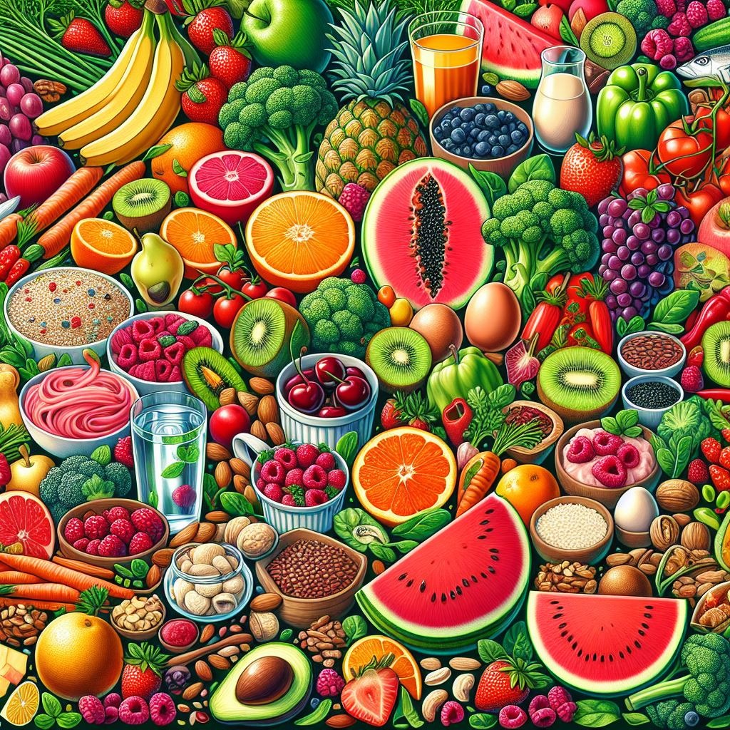 • Frutas: Frutas rojas (arándanos, fresas, moras), kiwi, naranjas, papaya, y guayaba (ricas en vitamina C para fortalecer el colágeno).