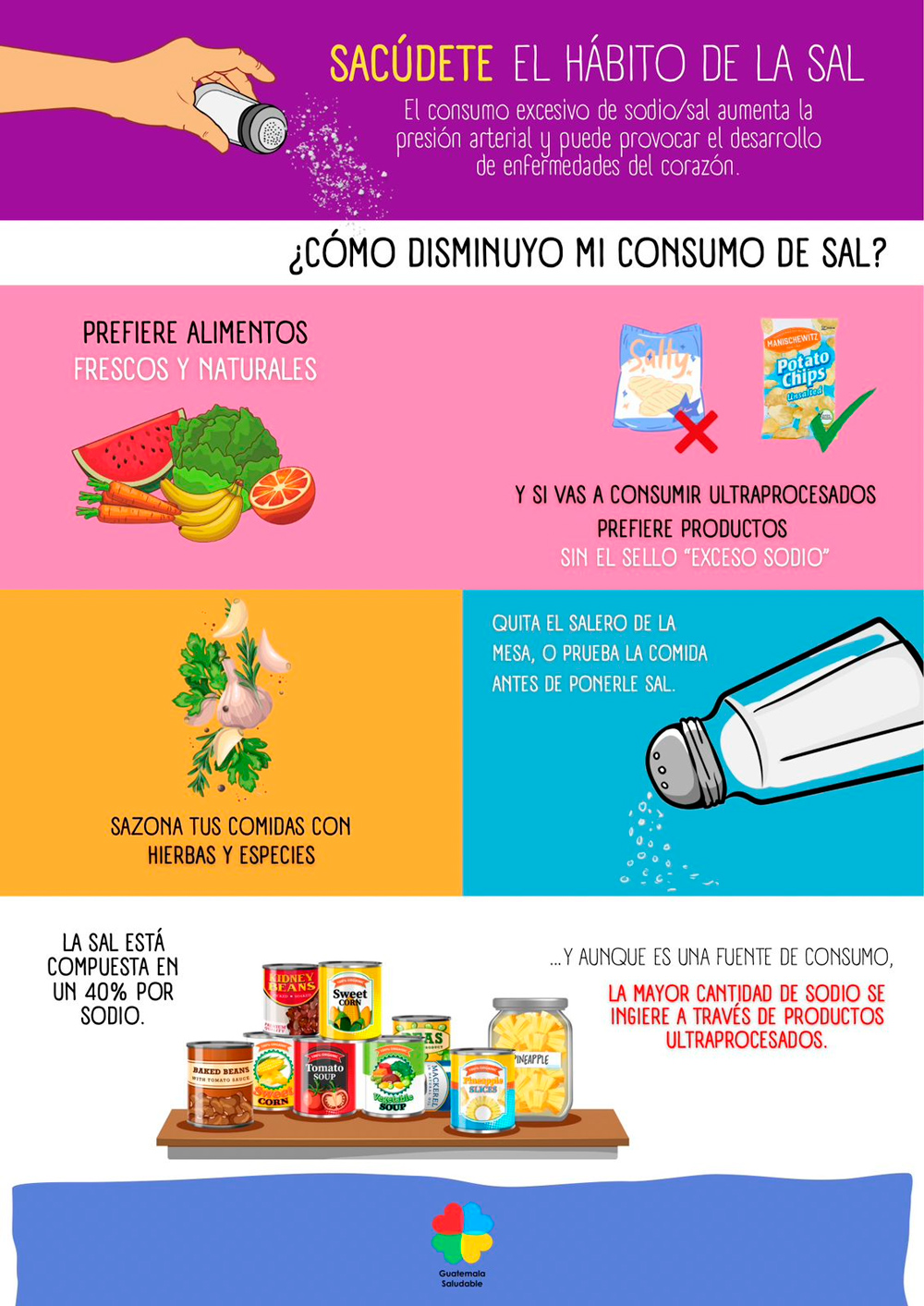 Para reducir la ingesta de sal, la coalición Guatemala Saludable recomienda elegir alimentos frescos y naturales; dar sabor a las comidas con hierbas y especias; si se eligen alimentos ultraprocesados, preferir productos que no tengan el sello “exceso sodio”; y retirar el salero de la mesa.