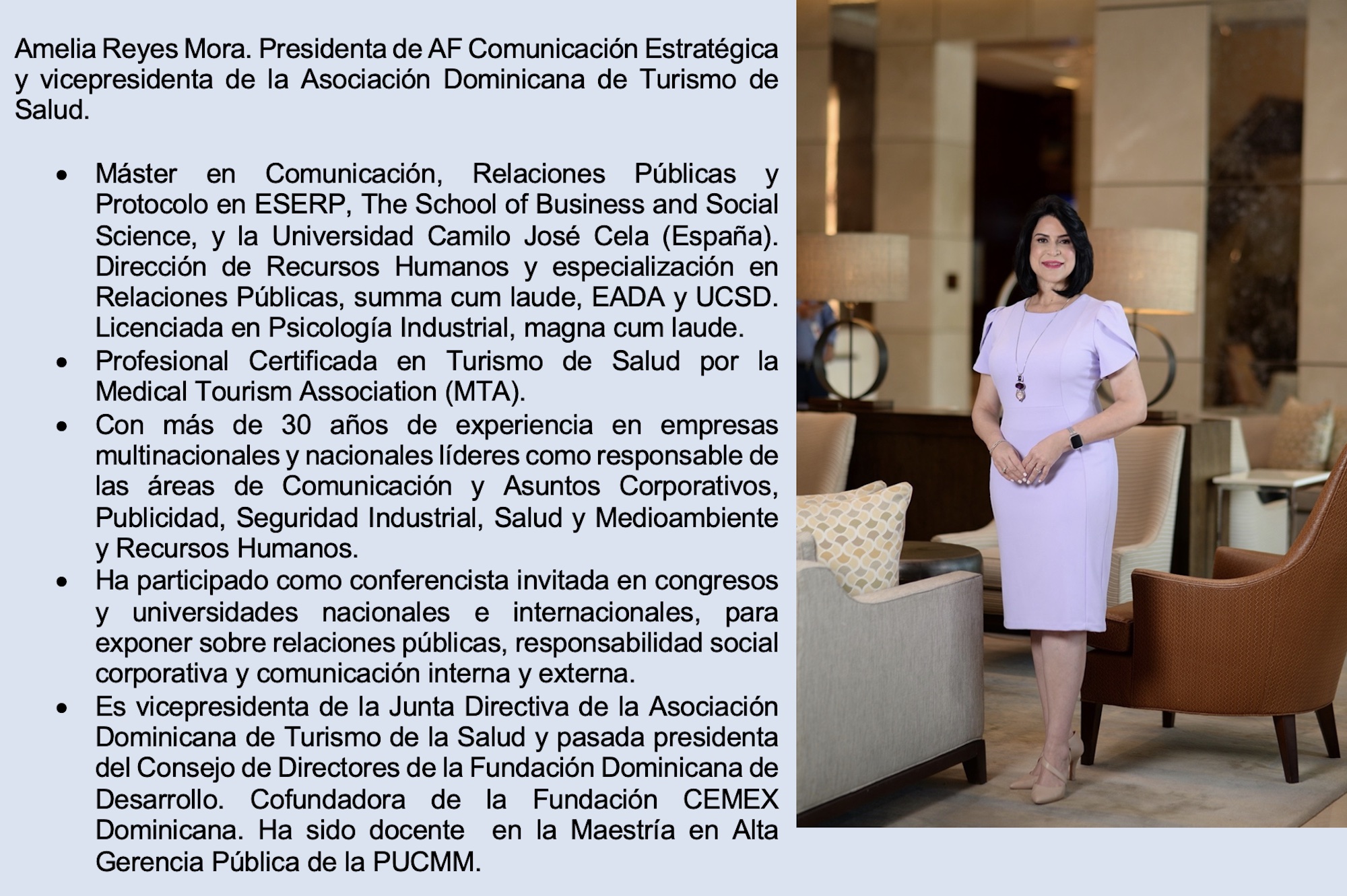 Amelia Reyes Mora, presidenta de AF Comunicación Estratégica y vicepresidenta de la Asociación Dominicana de Turismo de Salud, señala la importancia del 2º Congreso Latinoamericano de Salud Digital, “El Camino hacia una Transformación Digital Integral”, que se efectuará el 6 y 7 de septiembre en el Hotel Intercontinental de Santo Domingo, en República Dominicana.