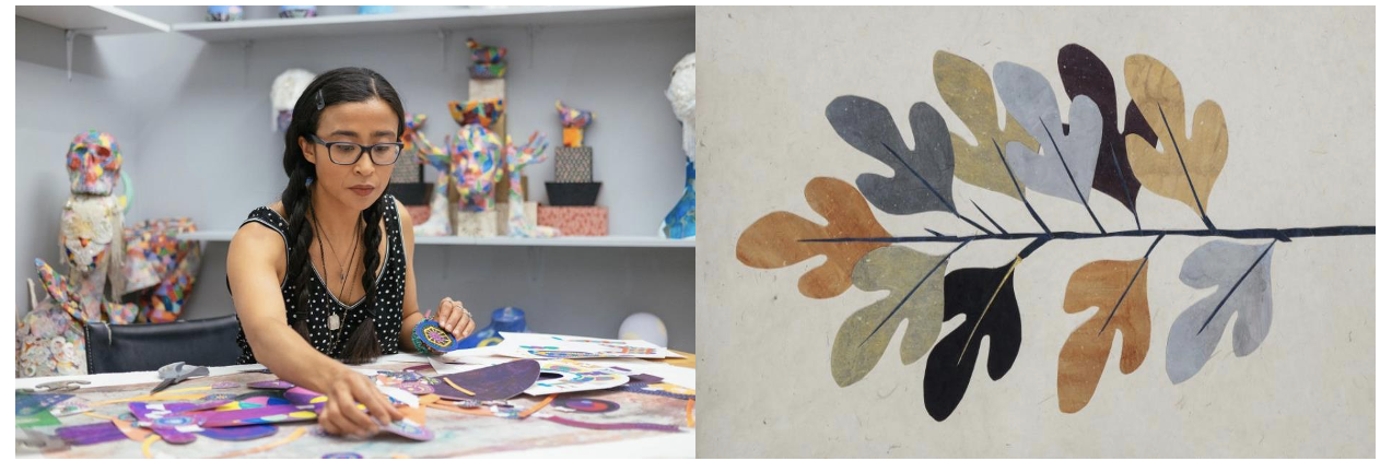 Woolfalk utiliza diversos medios, incluidos los textiles y una combinación de métodos de impresión tradicionales y procesos de impresión digital. En su entrevista, ella habló sobre cómo su singular crianza moldeó significativamente su mundo creativo. Nacida y criada en Nueva York, Woolfalk compartió historias de los veranos que pasó con su abuela materna en Gifu, Japón. Algunos de sus collages textiles se inspiraron en estas experiencias.