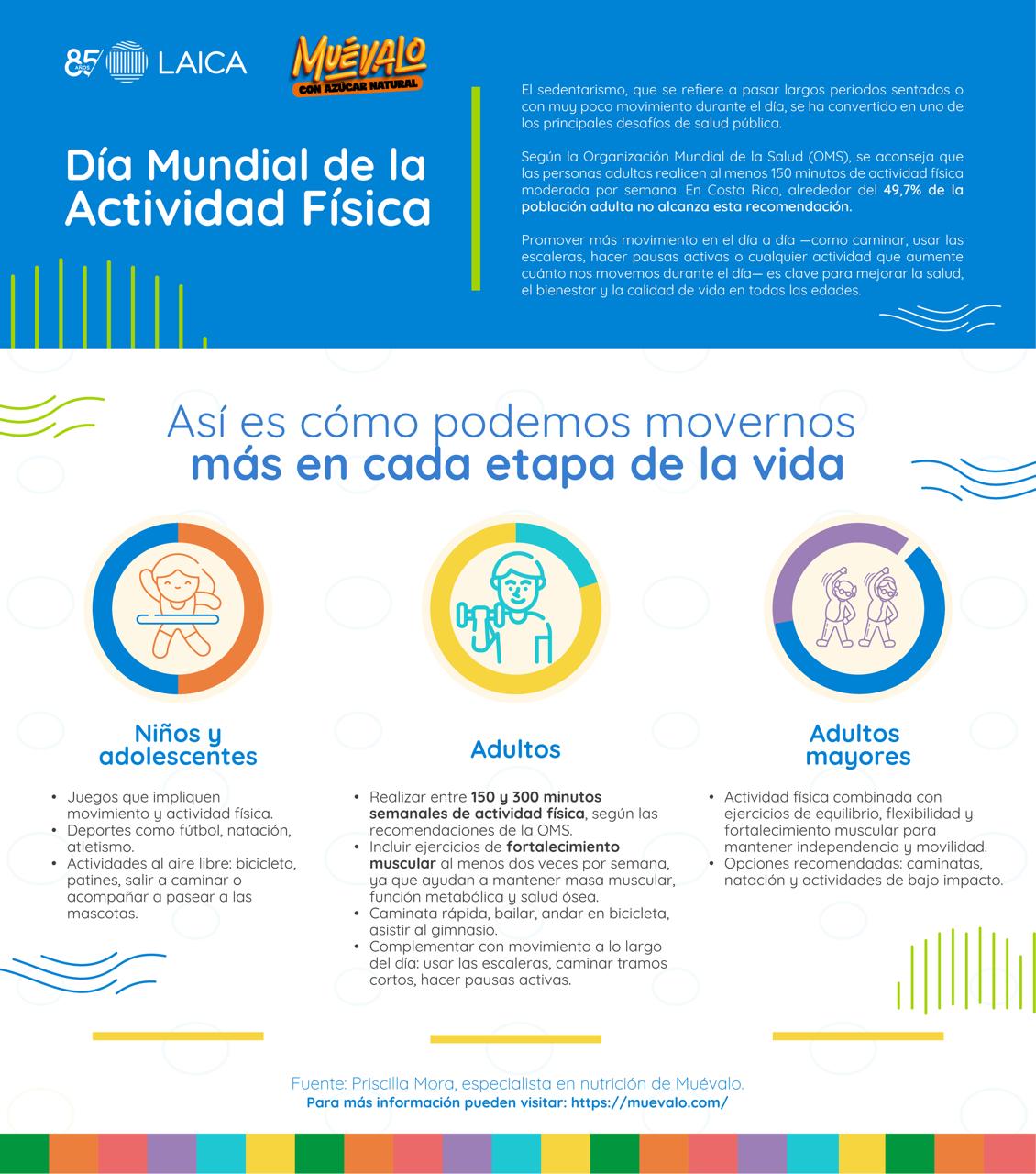 En el marco del Día Mundial de la Actividad Física, la plataforma Muévalo de LAICA sus marcas nacionales de azúcar Doña María y Zukra, hacen un llamado a la población costarricense a combatir el sedentarismo y adoptando hábitos de movimiento que favorezcan la salud y el bienestar,  recordando que cada paso cuenta para construir una vida más activa y saludable. Este enfoque también promueve el equilibrio, destacando que una persona activa puede disfrutar de todos los grupos de alimentos, incluyendo el azúcar, como parte de una alimentación balanceada.