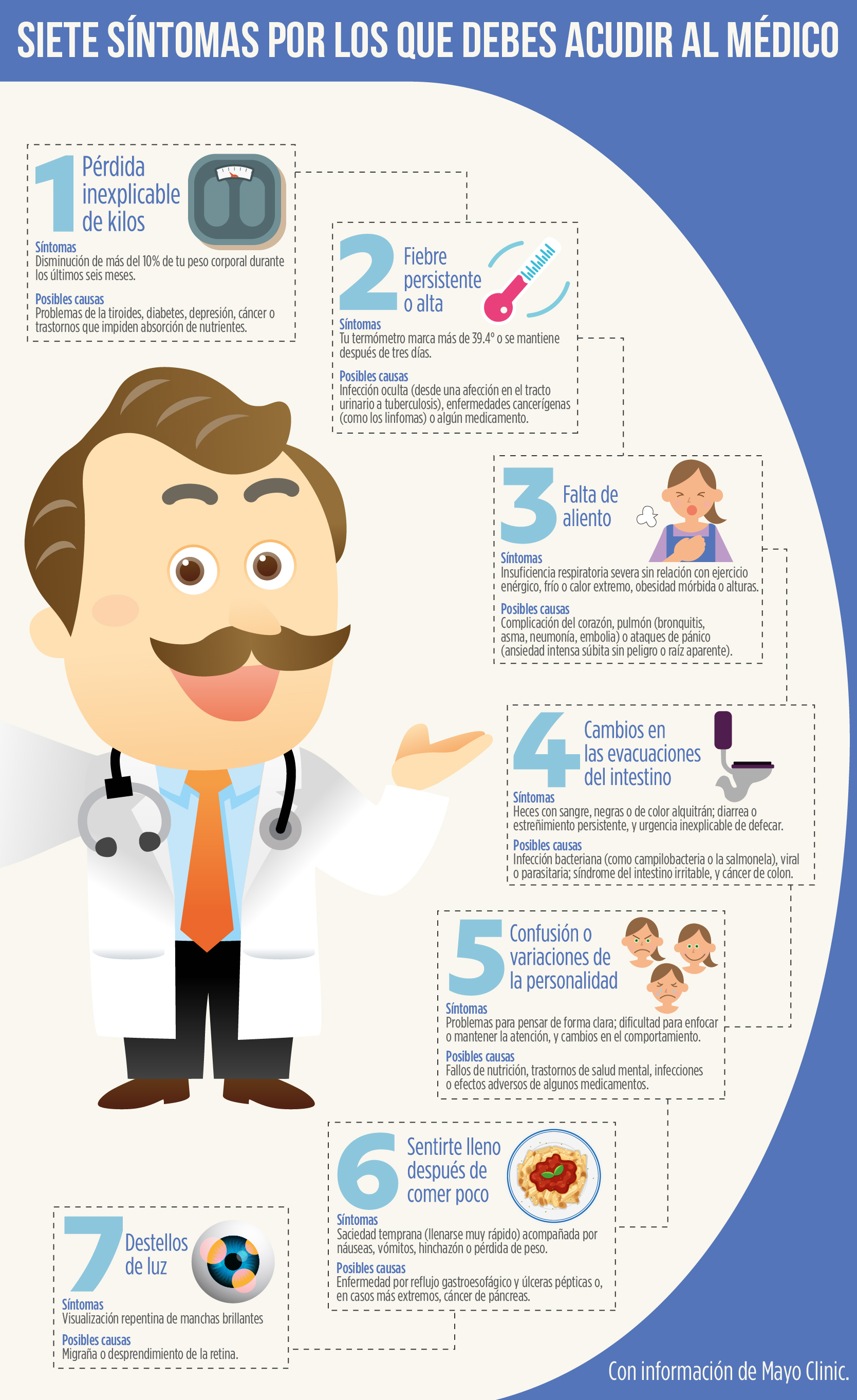 El dolor de pecho, la pérdida de visión o de habla repentina y el dolor abdominal severo requieren de atención médica inmediata — pero ¿qué ocurre con las alertas más sutiles? Puede ser complicado saber qué hacer. A continuación Mayo Clinic brinda una lista de siete señales y síntomas que merecen atención.