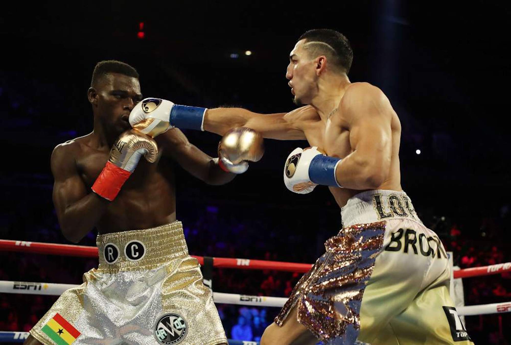 La noche del 14 de diciembre de 2019, el boxeador hondureño Teófimo López (derecha) derrotó al campeón defensor, el ghanés Richard Commey (izquierda), para proclamarse como el nuevo campeón del mundo en la categoría de peso ligero de la Federación Internacional de Boxeo (FIB).