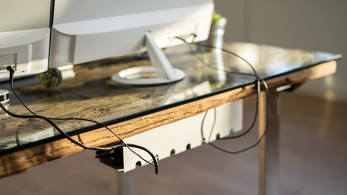 Asegúrese de tener suficientes tomacorrientes y protectores contra sobretensiones para alimentar todos sus dispositivos, y mantenga los cables ordenados y etiquetados para evitar enredos. Utilice organizadores de cables o clips para asegurar los cables y colóquelos detrás o debajo de los muebles para mantener ordenado el espacio de trabajo.