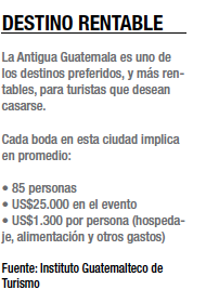 El turismo de bodas y lunas de miel está en crecimiento en Guatemala. En octubre se realiza un evento junto con la International Association of Destination Wedding Professionals, en la que participarán unos 50 agentes de viajes y wedding planners de Estados Unidos y Canadá, y del 18 al 23 de octubre se