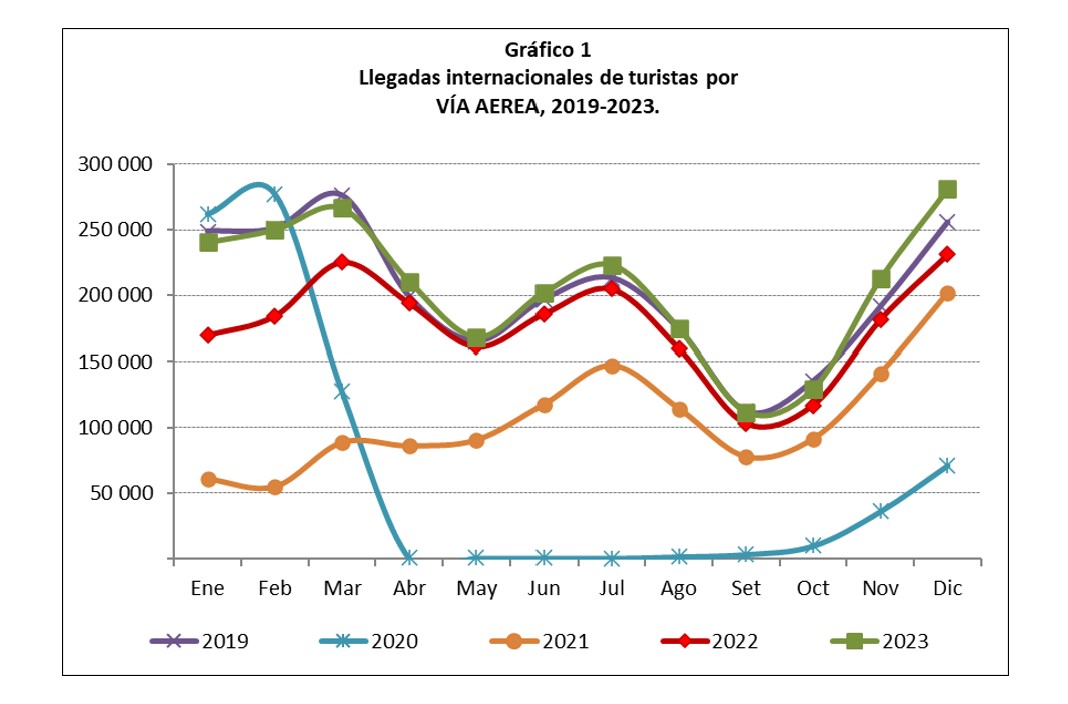 El acumulado de llegadas de turistas por vía aérea en el período de enero a diciembre 2023 alcanzó la cifra impresionante de 2 471 150, lo que supone un crecimiento del 16,7% en comparación con el mismo período del año 2022 y de  2,2% en comparación con 2019.
