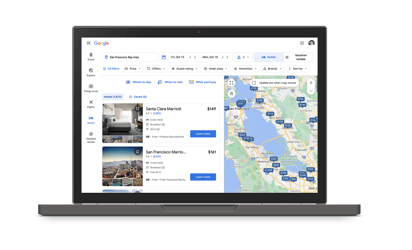 Ahora podrá ver información sobre los esfuerzos de sostenibilidad de hoteles cuando los busques en Google. Los hoteles que están certificados por cumplir con altos estándares de sostenibilidad de ciertas organizaciones independientes, como Green Key o EarthCheck, tendrán una insignia con certificación ecológica junto a su nombre.