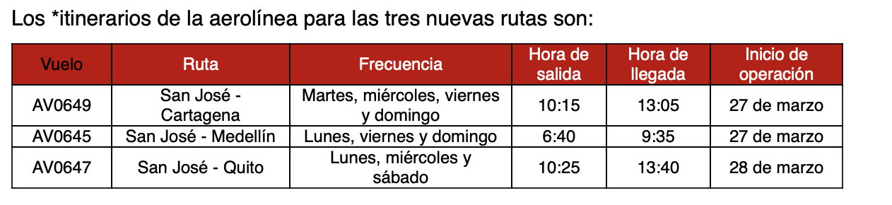 Con el lanzamiento de 3 nuevas rutas sin escalas, Avianca sigue expandiendo su red, una de las más robustas de la región, y continúa apostando por el crecimiento de la industria de la aviación y la reactivación del turismo y la economía en Costa Rica.