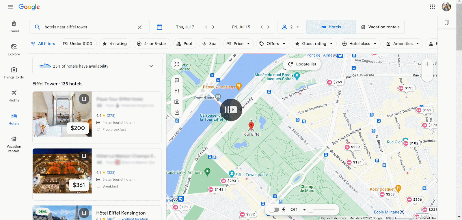 Para algunos viajes, es posible que desee acceder fácilmente a un determinado lugar turístico o dirección. A partir de hoy, puede ingresar esa ubicación en la barra de búsqueda de hoteles o alquileres vacacionales y verá un interruptor para mostrar las propiedades cercanas, a 15 o 30 minutos a pie o en automóvil. Esto podría ser especialmente útil si va a un evento, como una boda o una conferencia, y quiere quedarse cerca del lugar.