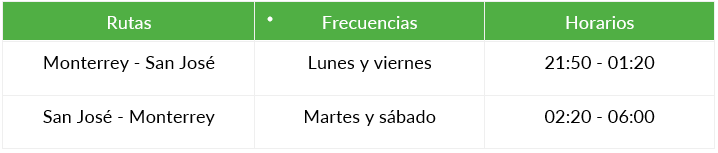 La nueva ruta Monterrey – San José – Monterrey cuenta con dos frecuencias semanales los días lunes y viernes desde Monterrey, y martes y sábado desde San José al ser un vuelo nocturno. Al llegar, los viajeros pueden disfrutar de la amplia conectividad que Viva ofrece desde Monterrey, donde podrán conectar a más de 45 destinos nacionales e internacionales.