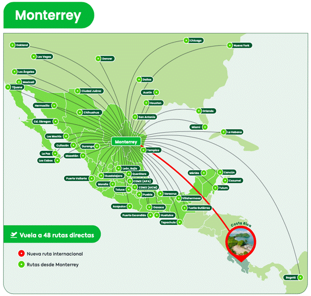 Este servicio ofrecerá a los viajeros costarricenses la oportunidad de conectar desde Monterrey con más de 45 destinos en México y Estados Unidos.